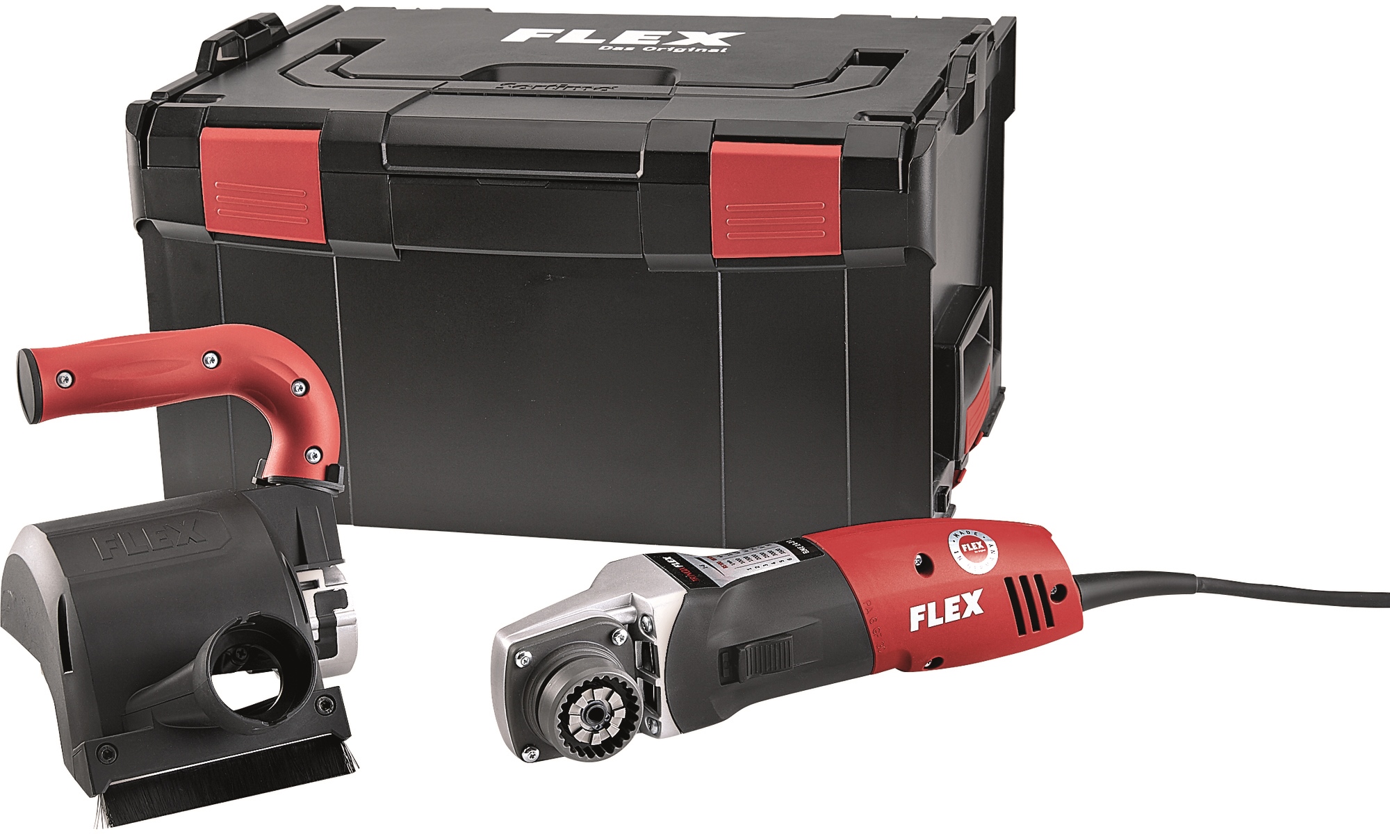Accessoire de brossage avec capot de protection amovible et raccord d'aspiration Ø 32 mm pour un travail sans poussière. Comprend une butée de guidage pour le satinage de pièces étroites afin d'obtenir un ponçage rectiligne.