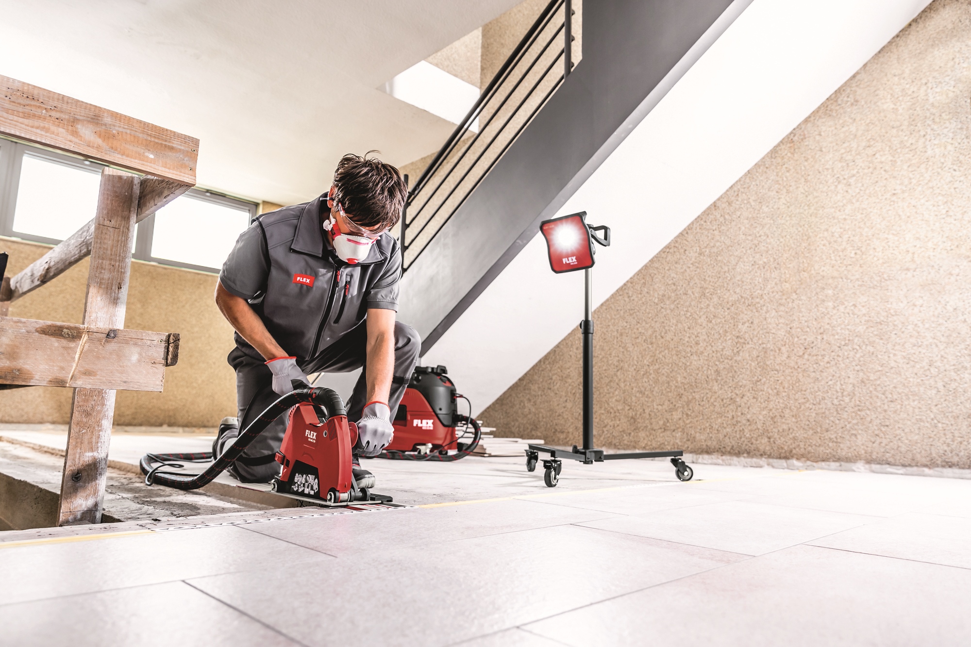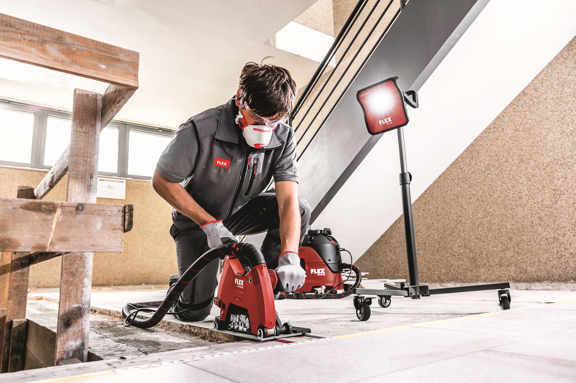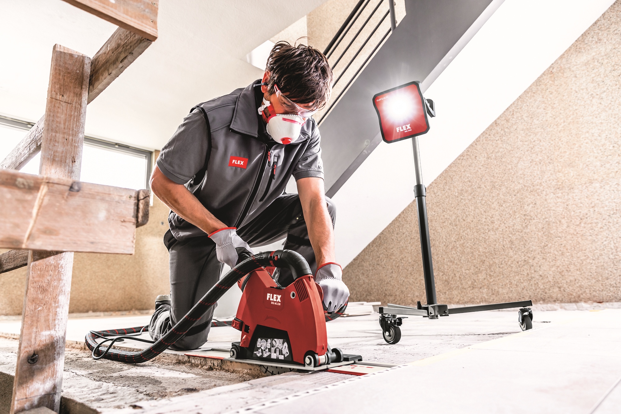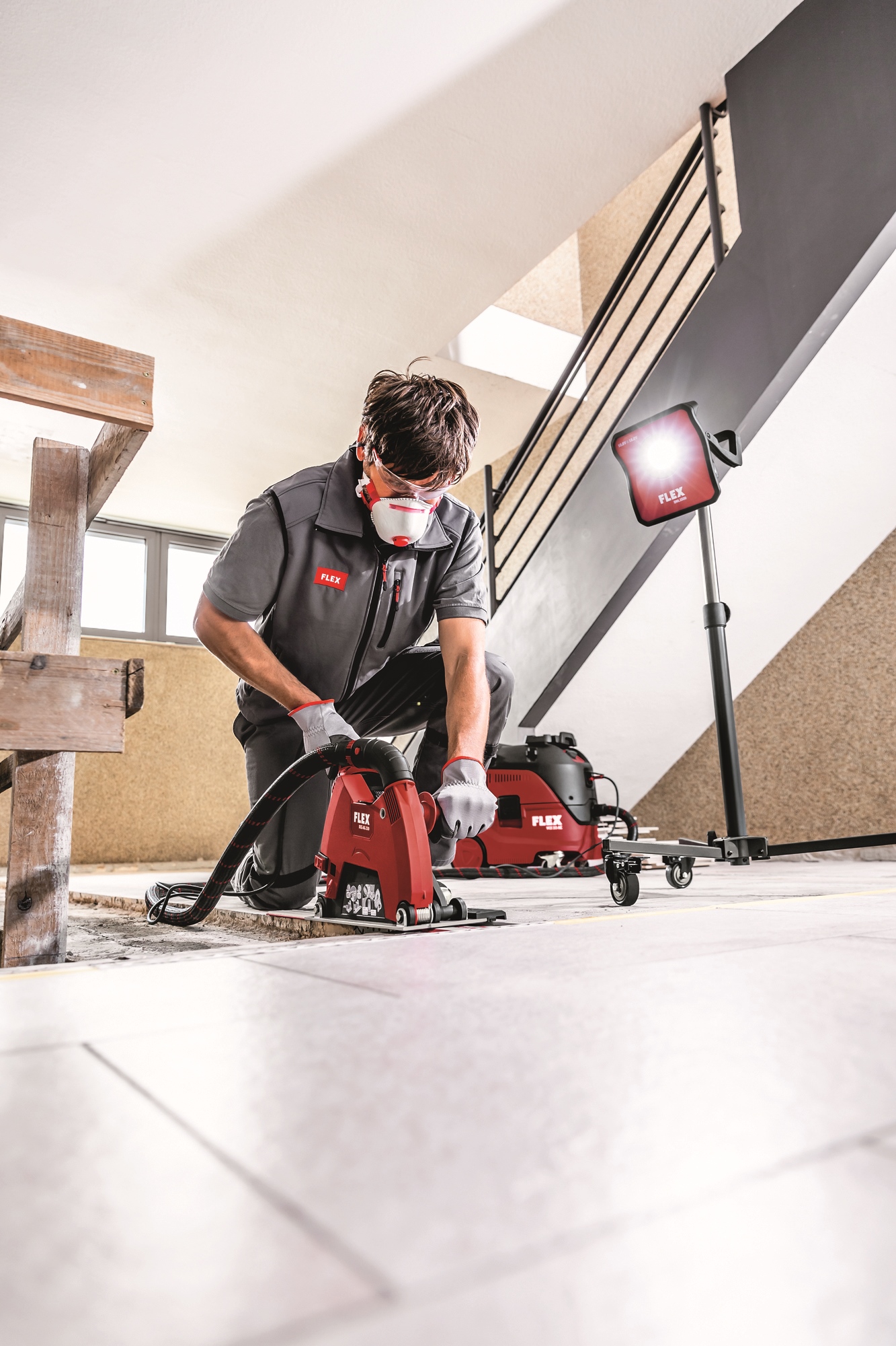 Prête à l'emploi, meuleuse d'angle avec capot d'aspiration déjà monté dans la mallette. Disque diamanté Diamantjet - Disque diamanté standard béton 230 mm inclus