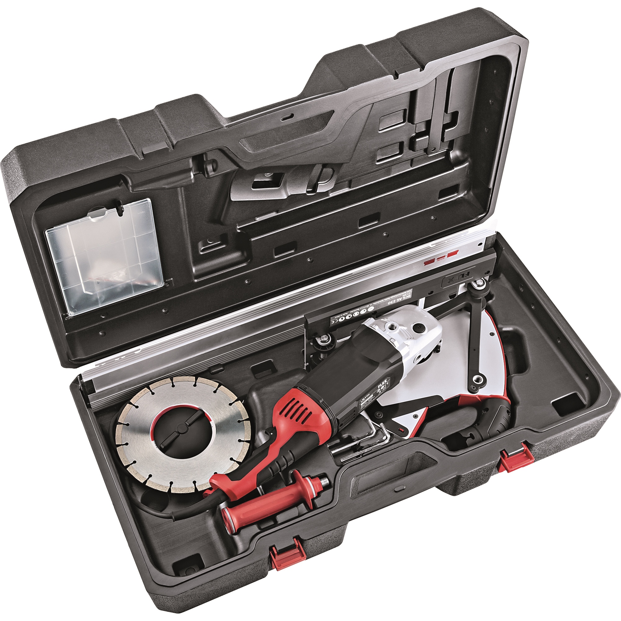 Mallette avec compartiment dans le couvercle pour les petites pièces, rangement pour disque diamanté, poignée latérale et guide-chaîne de 800 mm.