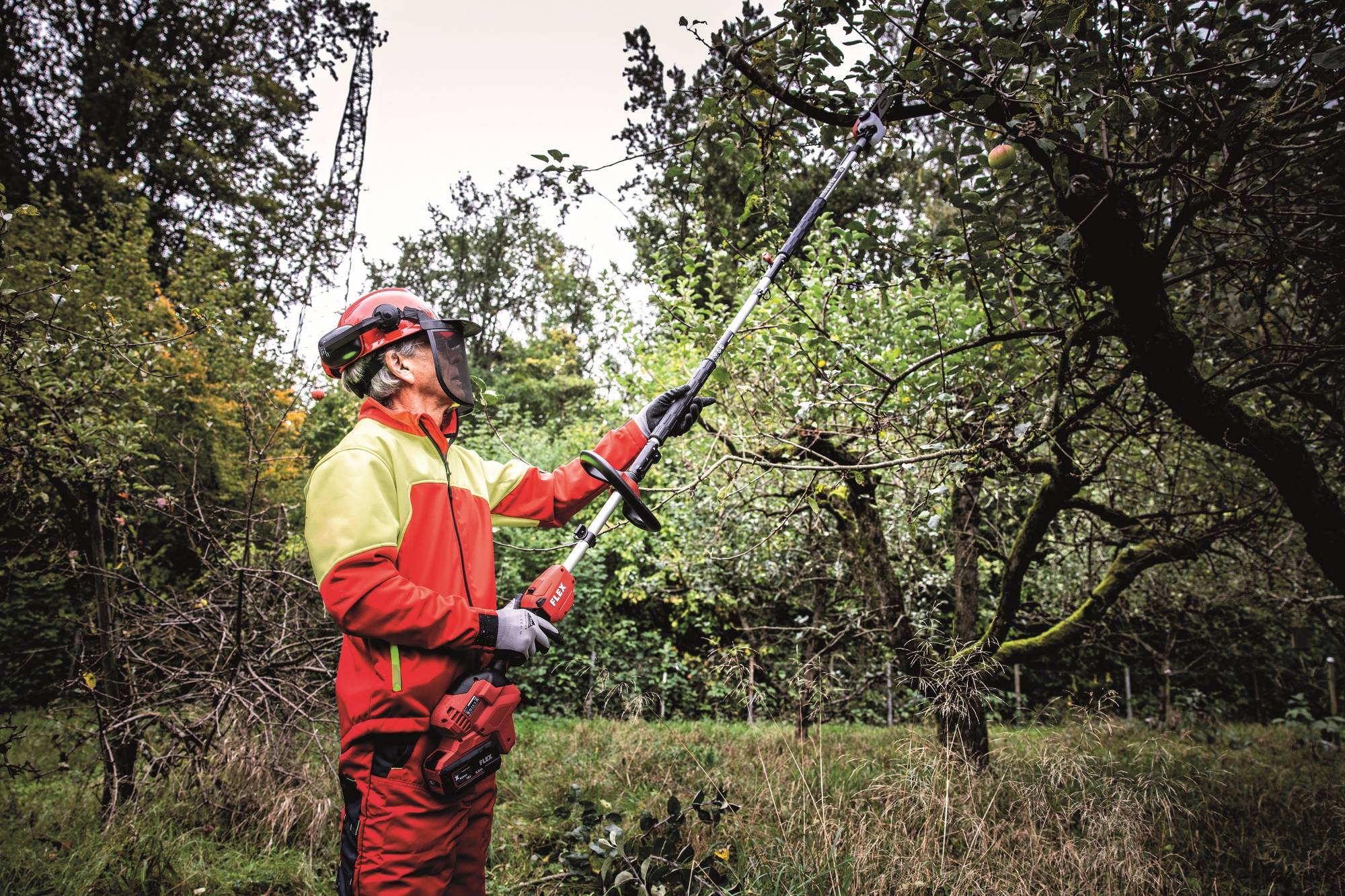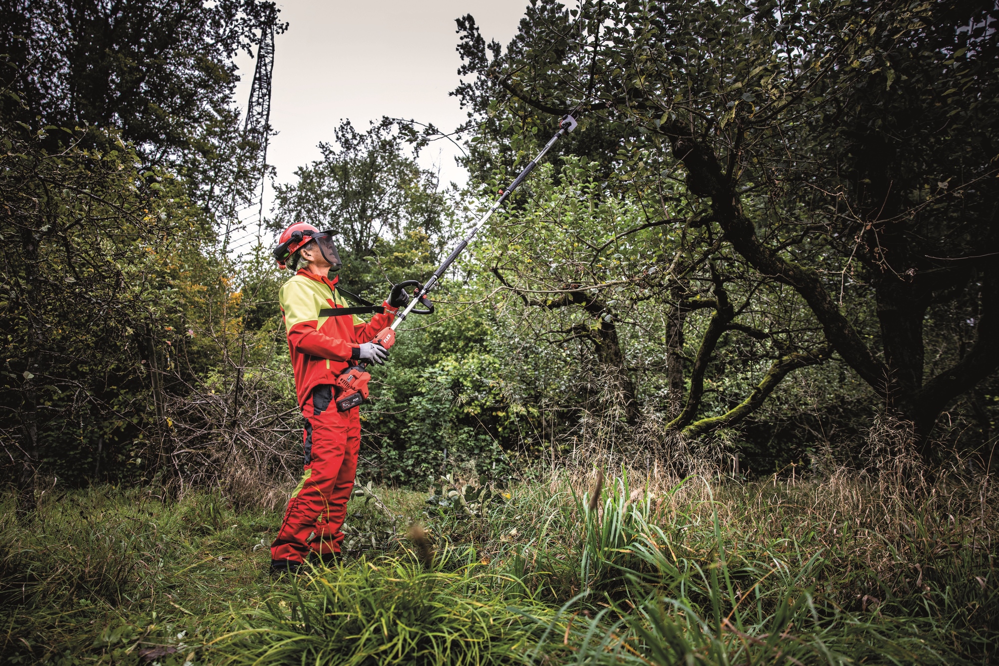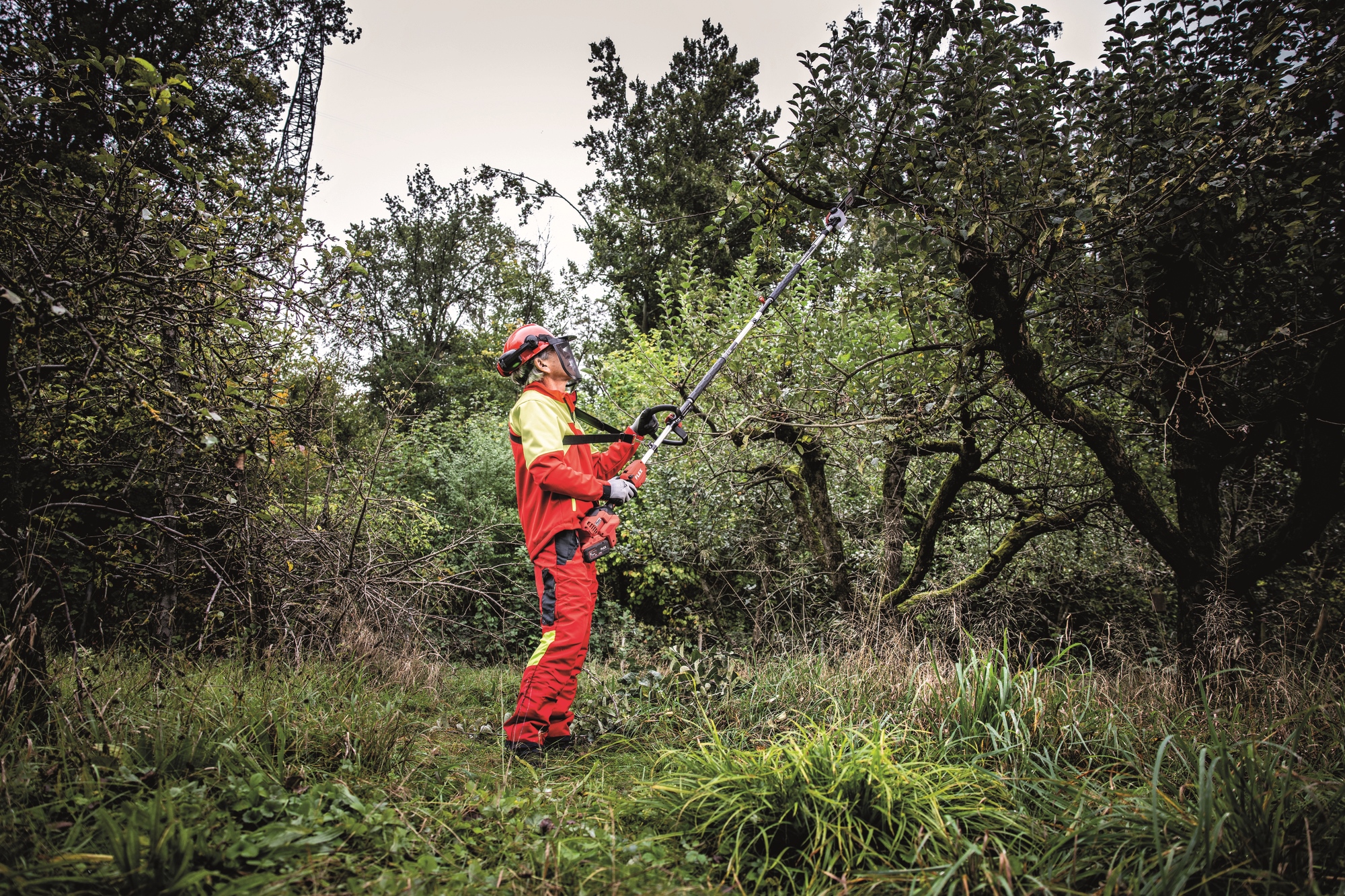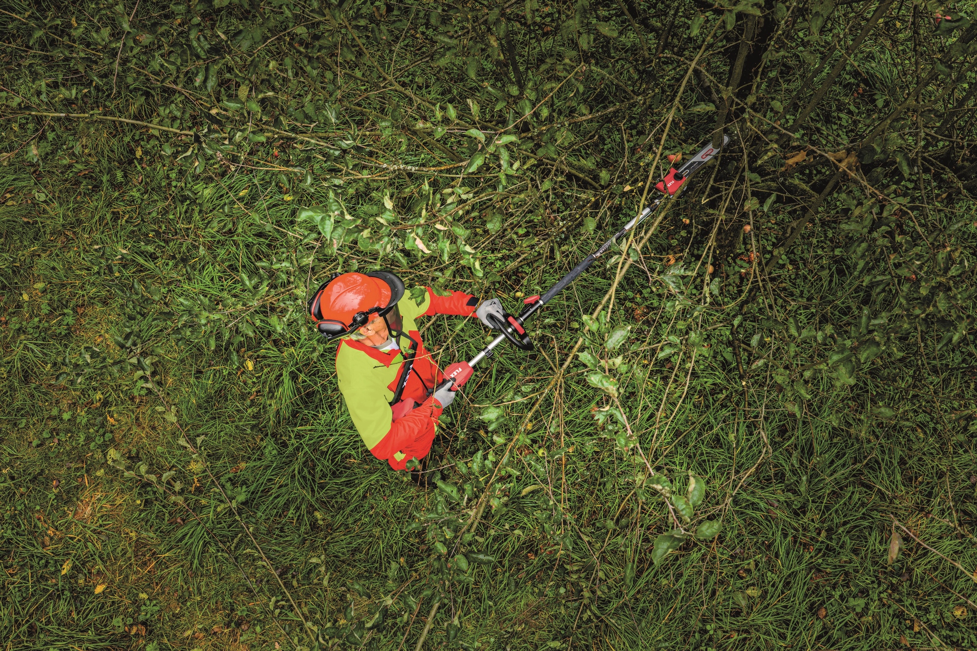 L'élagueuse sur perche, y compris la rallonge de 80 cm pour l'entraînement de base de la batterie ou le coupe-herbe à batterie, permet de couper les branches hautes sans échelle. Montage de l'accessoire sans outil