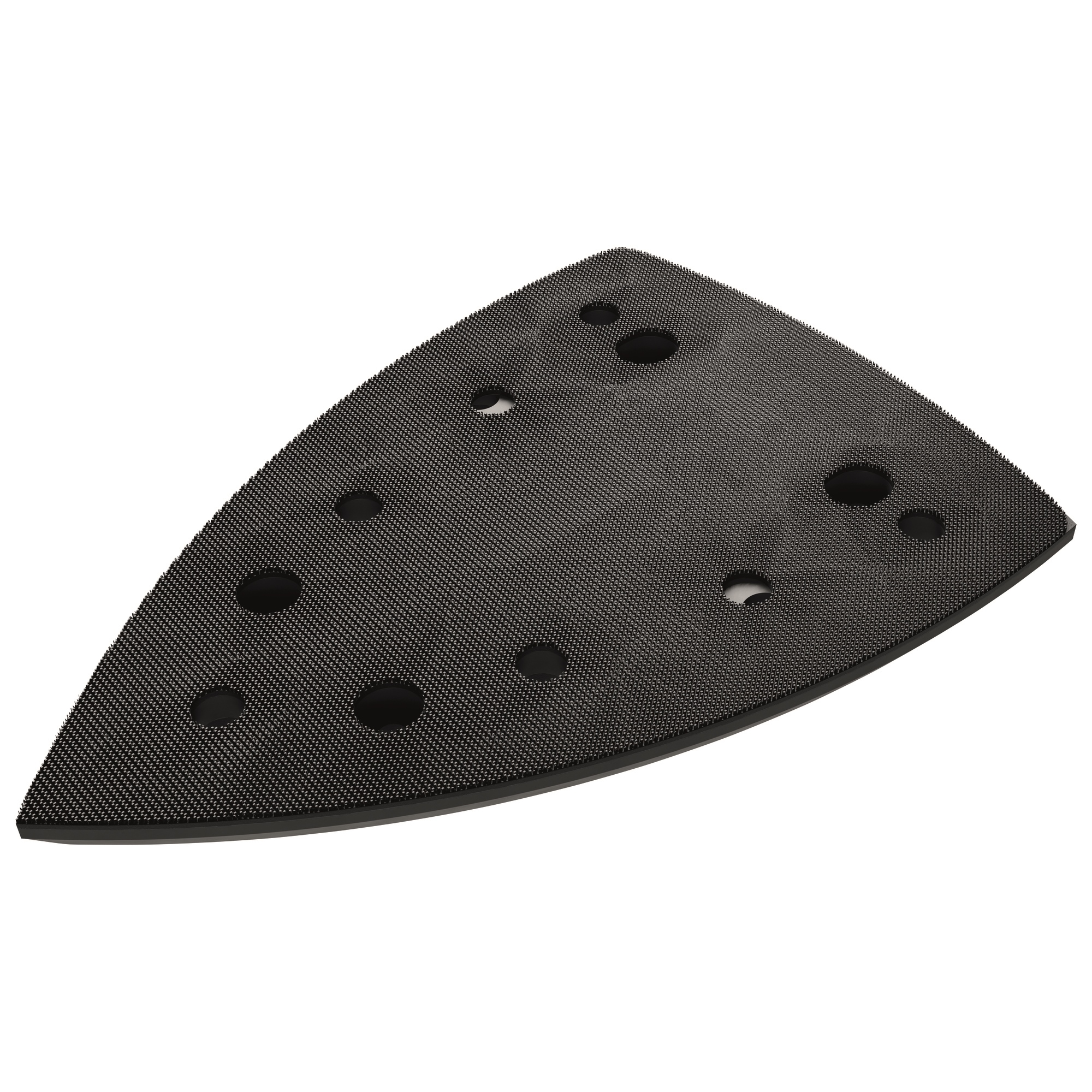 Plateau abrasif delta composé d’une matière spéciale à haute résistance avec perforations d’aspiration (10x), avec des arêtes biseautées pour protéger les pièces. Adapté à tous les abrasifs courants. Pour le ponçage des arêtes, des coins ainsi que des surfaces petites et étroites.