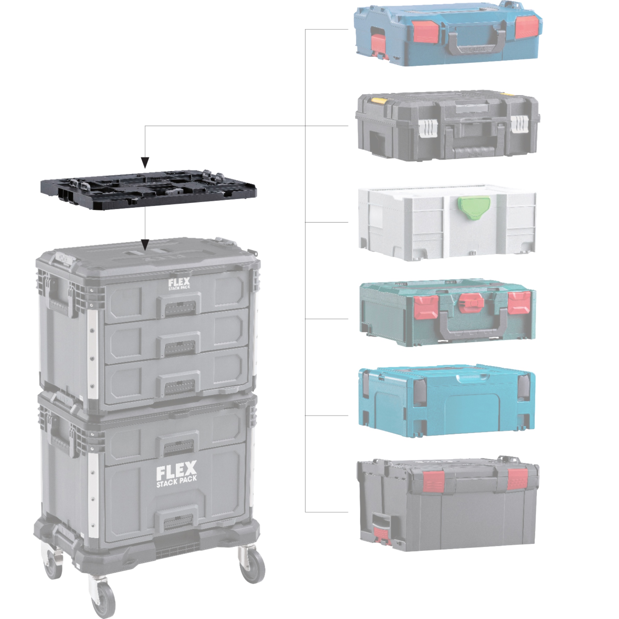 Pour fixer toutes les caisses courantes sur le système STACK PACK. La plaque d'adaptation permet de combiner les caisses STACK PACK avec les caisses suivantes: