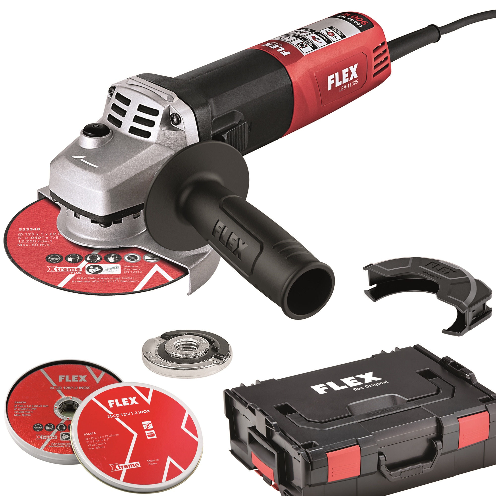 Il kit FLEX LE 9-11 125 L-BOXX® + M-CD 125/1,2 INOX è un set promozionale di alta gamma destinato a lavori professionali di taglio e smerigliatura. Combina la smerigliatrice angolare regolabile LE 9-11 125 da 900 W con 10 dischi da taglio INOX extra-sottili per tagli netti e senza sbavature su acciaio inossidabile e acciaio - il tutto riposto in tutta sicurezza nella robusta valigetta del sistema L-BOXX®.