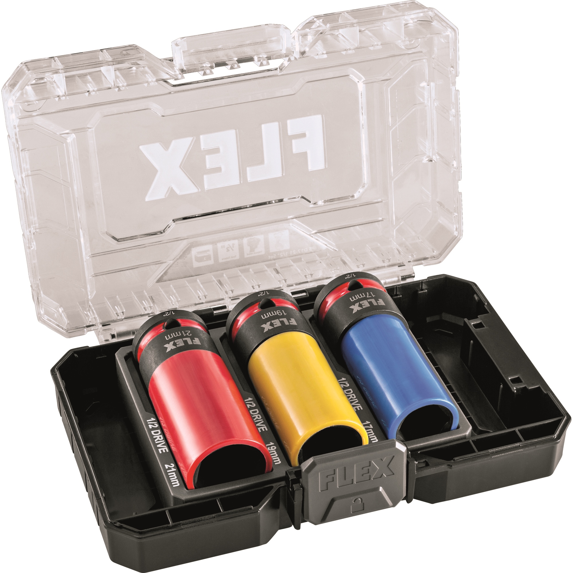 Set di bussole a percussione su misura per chiavi a percussione, appositamente progettato per cerchi in alluminio con protezione PET contro i graffi. Realizzato in acciaio legato di alta qualità, molto resistente e durevole. Con codice colore per una facile identificazione delle misure. Scatola compatibile con il sistema STACK PACK, impilabile. Dimensioni 1/2 pollice.