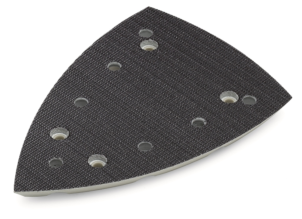 Piastra di levigatura triangolare realizzata in materiale ad alta resistenza con fori di aspirazione.
