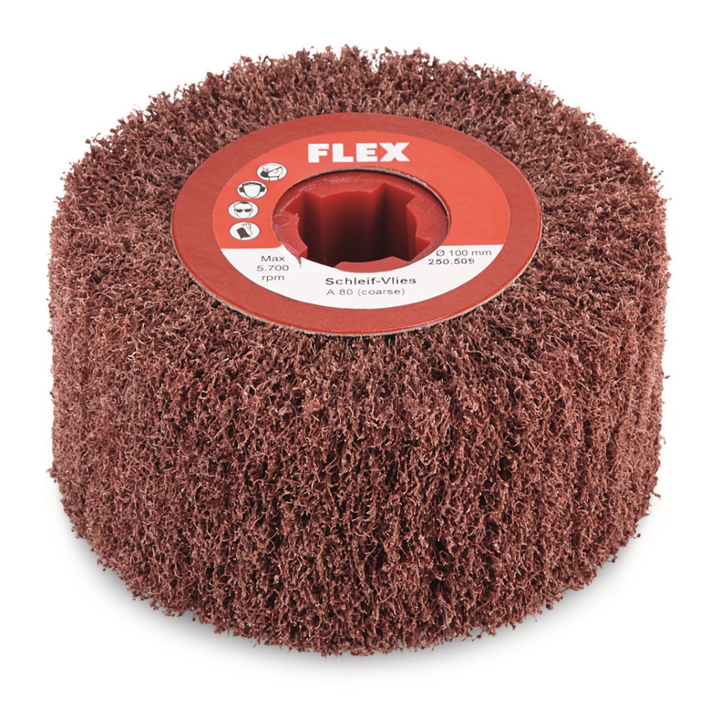 Rullo elastico in tessuto non tessuto di nylon impregnato di grani abrasivi e dotato di una scanalatura per la chiave. Produce belle superfici su acciaio inox, rame, alluminio, ottone, ecc. Adatto anche per la pulizia di rivestimenti ossidati e la levigatura di plastica e legno.
