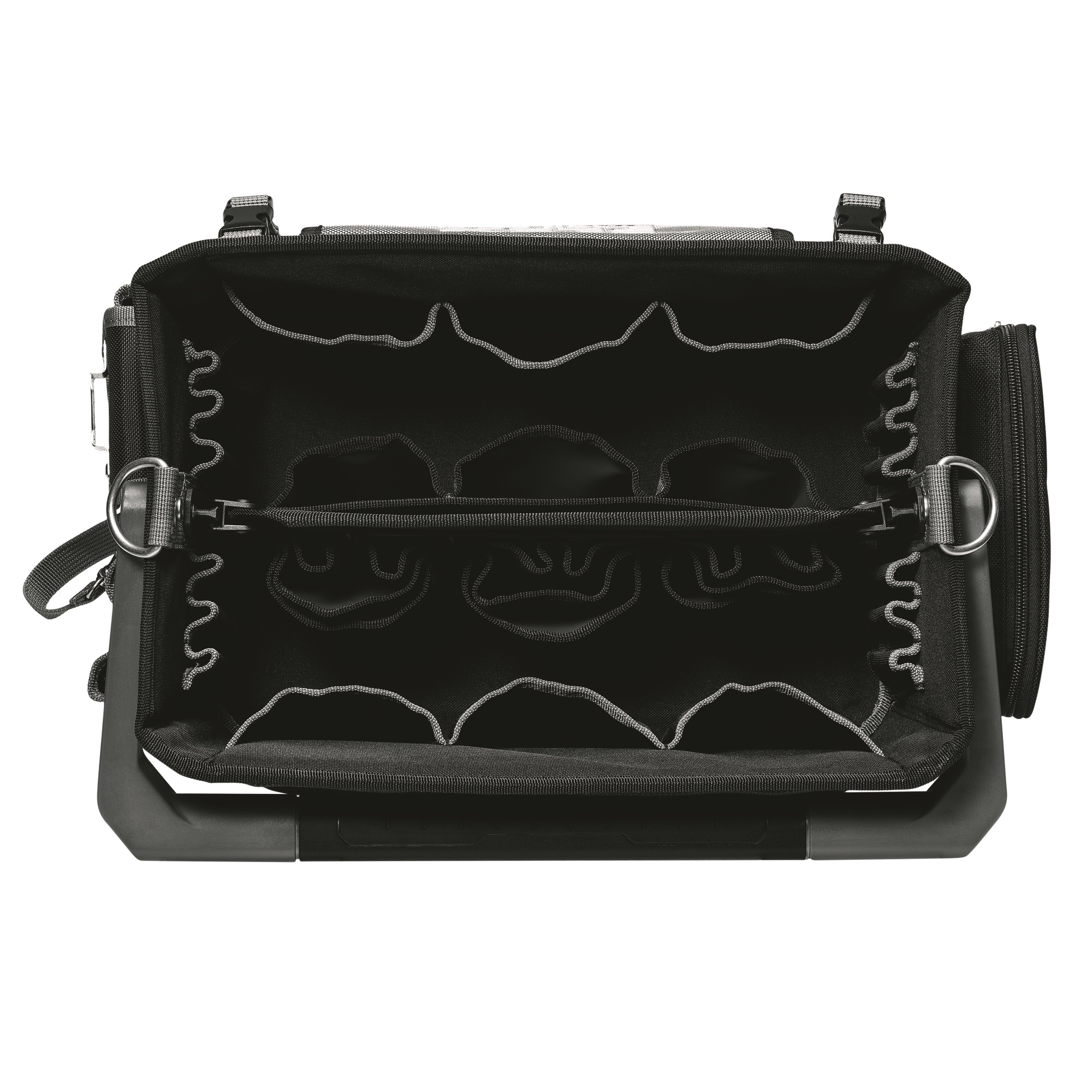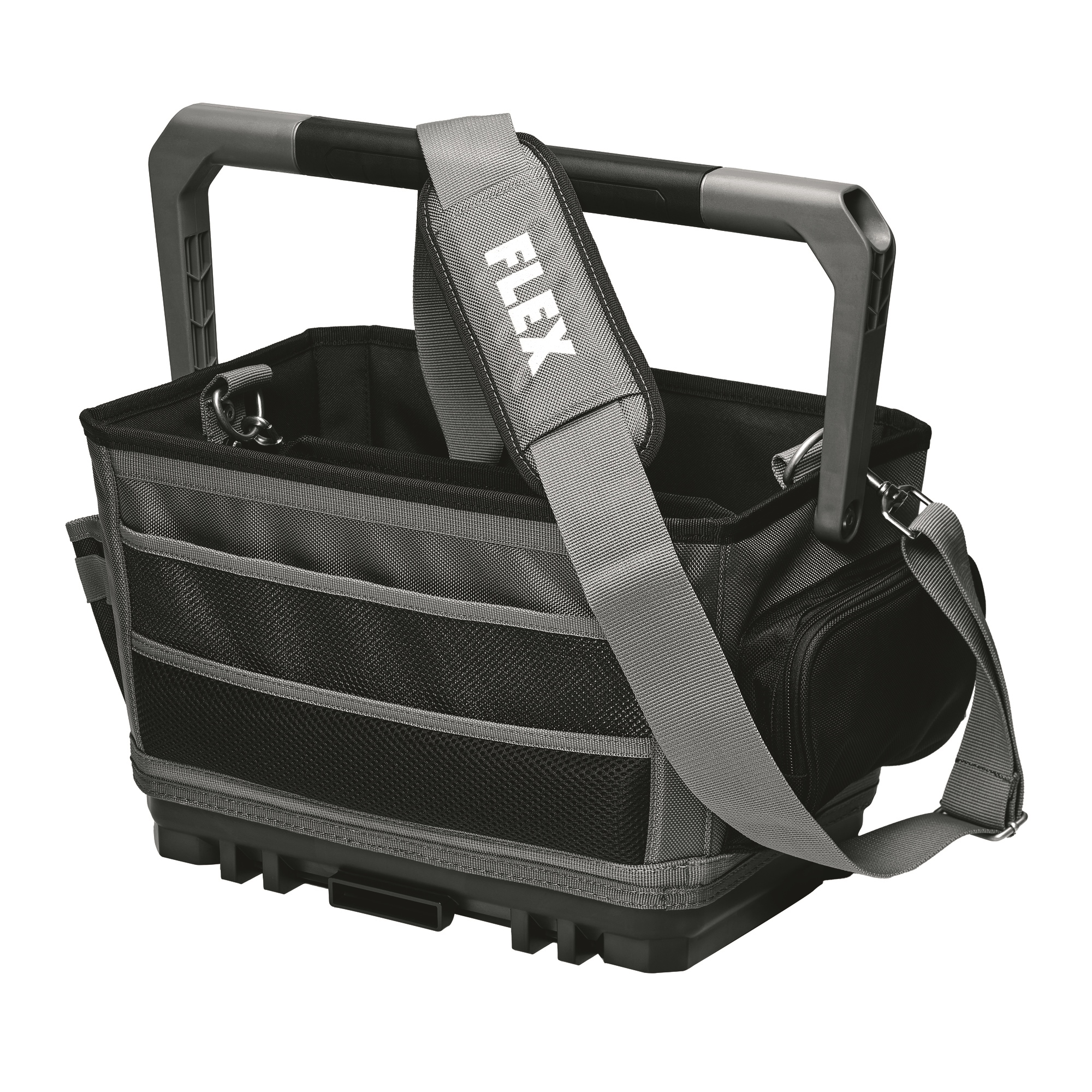 Gli attrezzi e gli accessori sono riposti in modo ordinato nei 44 scomparti e nelle tasche interne della borsa per attrezzi. Opzioni individuali grazie agli scomparti interni ed esterni e al divisorio rimovibile con molti scomparti al centro della borsa. La robusta borsa è realizzata in poliestere di alta qualità a doppio strato. La borsa è dotata di una tracolla con spallaccio e di una maniglia girevole per un comodo trasporto. La borsa per attrezzi può essere fissata al coperchio dei box tramite il dispositivo di fissaggio rapido.